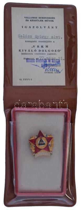 1980 k. Villamos Berendezés és Készülék Művek "VBKM - Kiváló Dolgozó" aranyozott, zománcozott fém jelvény igazolvánnyal, eredeti tokban (28x29mm) T:AU