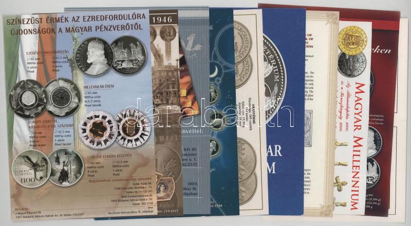 1946-2009. 10xklf színes MNB tájékoztató szép állapotban, közte Ezredfordulós érmék, 1100 éves Magyarország, Horoszkóp, Magyar Millenium, Történelmi évfordulók ezüst érmeken