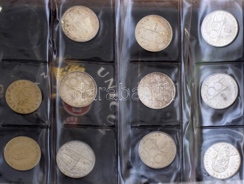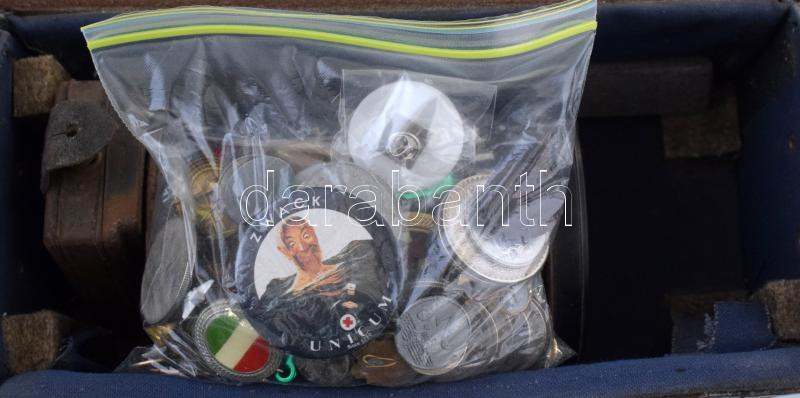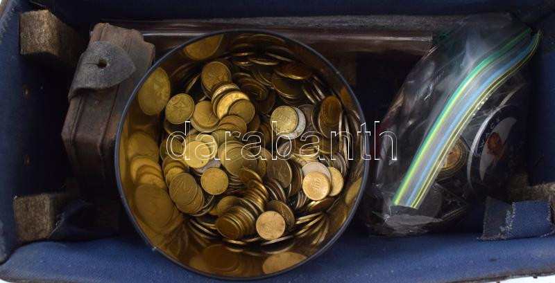 "Nagypapa kincsesládája" régi bőr vasutas(?) táskában, bruttó ~4,2kg súlyban, benne 1992-1994. 200Ft Ag (9db), illetve jelvények, zsetonok, vas hamis érmék, 1-2-5Ft-os érmék Unicumos dobozban, valamint működésképtelen zsebóra és elemlámpa. T:vegyes