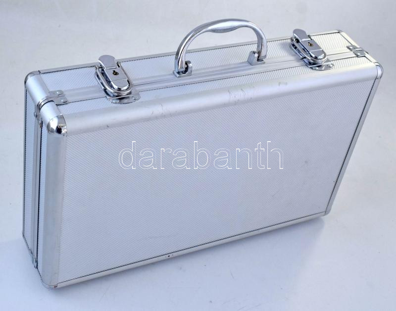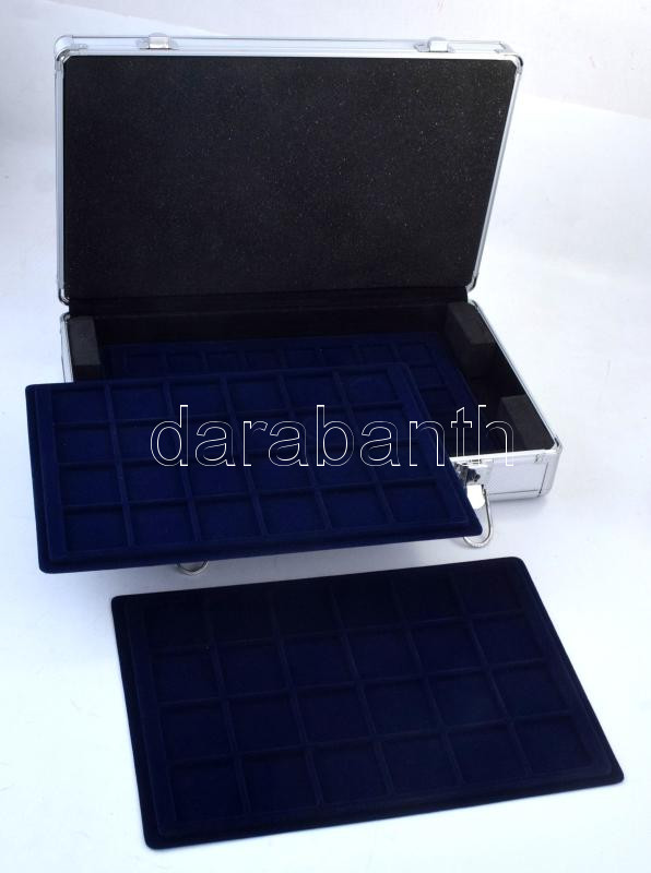 Alumínium érmetartó koffer használt, de újszerű állapotban, kulcsokkal. Benne 4db érmetartó tálca: 2db 32x32mm-es és 2 darab 40x40mm-es fészkekkel. Összesen 128 férőhellyel