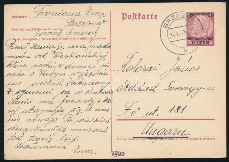 Osten 1940 PS-card to Hungary "BRZOZOW"