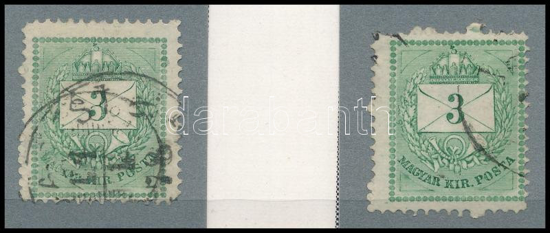 1874 2 db 3kr durva gyöngyjavítással (ex Orbán, Sebestyén aranyérmes kiállítási anyagból)
