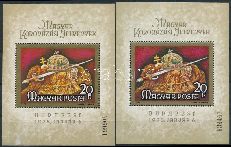 1978 Magyar koronázási jelvények vékony és vastag sorszámú blokk (az egyik blokkon gumihiba, kis hiba a kereten / gum disturbance, damage on the front)