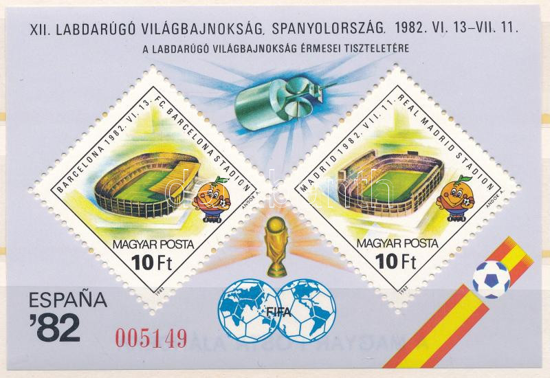 1982 Labdarúgó VB blokk hátoldalán "A MAGYAR POSTA AJÁNDÉKA" felirat (33.000)