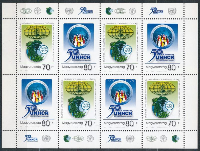 2001 Nemzetközi Szervezetek 50. évfordulója blokk, a jobb alsó 2. bélyegen kék folt a felirat mellett tévnyomat