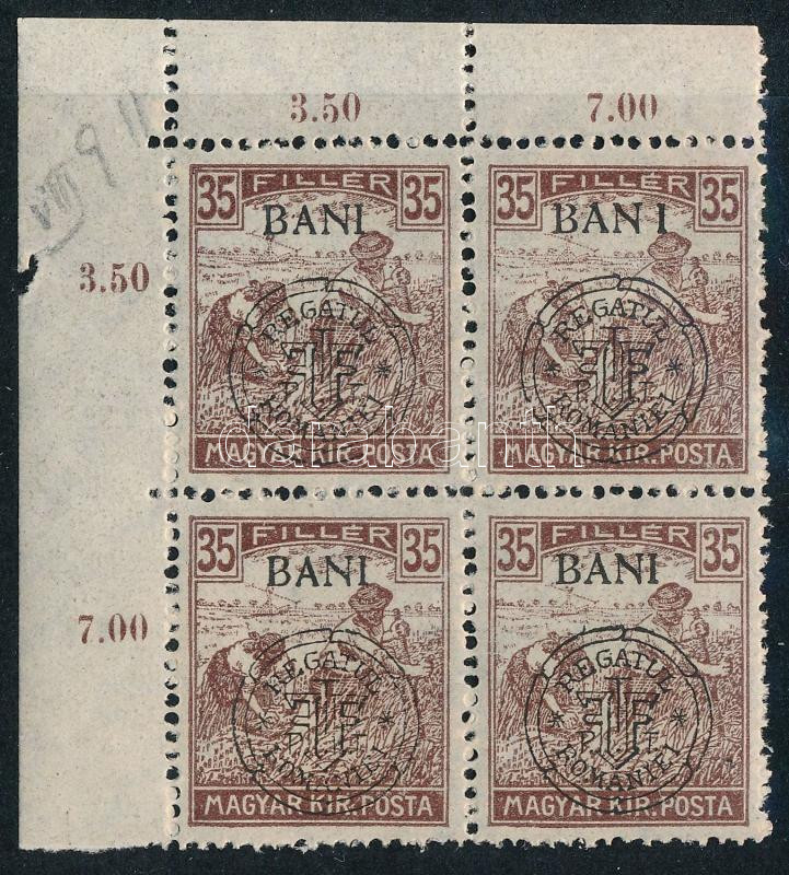 Kolozsvár 1919 Arató 35f ívsarki 4-es tömb a jobb felső bélyegen "BAN I" tévnyomat, Bodor vizsgálójellel