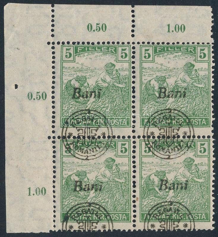 Nagyvárad 1919 Arató 5f ívsarki 4-es tömb eltolódott felülnyomással, Bodor vizsgálójellel