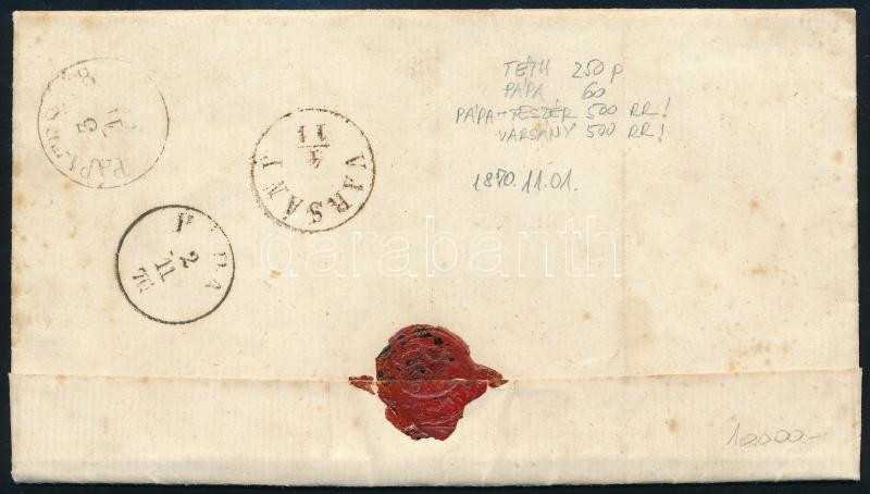 1870.11.01. Távolsági levél 5kr bérmentesítéssel, "PÁPA" és "PÁPATESZÉR" átmenő bélyegzésekkel, "TÉTH" - "VARSÁNY"