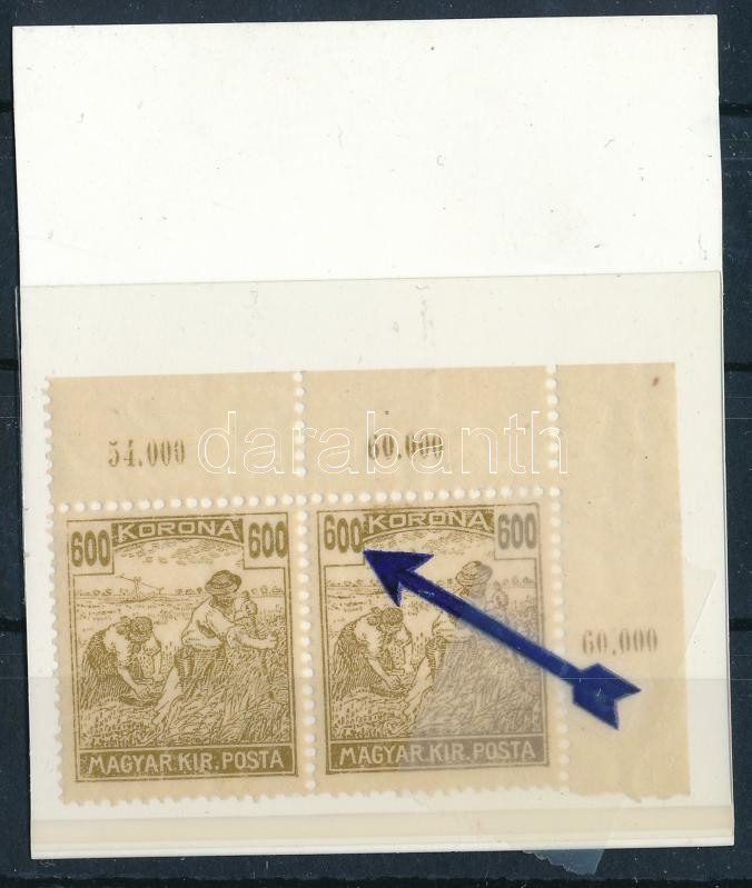 1920 Arató ívsarki pár, a jobb oldali bélyegen az értékszámban a 6-os megugrott