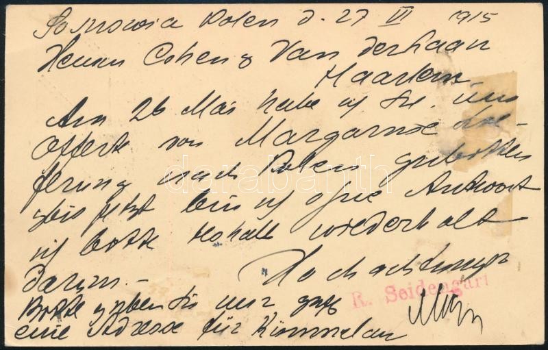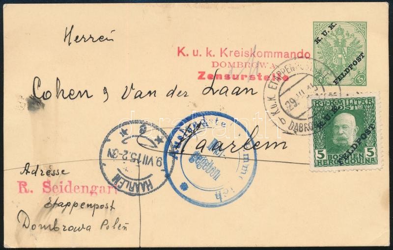 1915 Díj kiegészített díjjegyes levelezőlap Hollandiába küldve