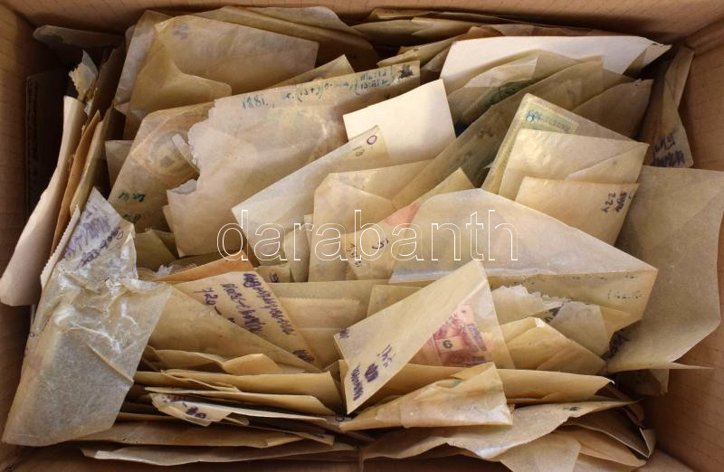 Pergamen tasakokba rendezett rengeteg okmánybélyeg a klasszikusoktól a forint időszakig. Érintetlen, átnézetlen anyag hagyatékból, hullámkarton dobozban.