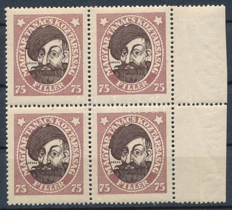 1919 Magyar tanácsköztársasági arcképek 75f ívszéli négyestömb álló vízjellel (32.000)