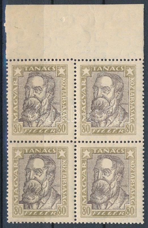 1919 Magyar tanácsköztársasági arcképek 80f ívszéli négyestömb álló vízjellel (32.000)