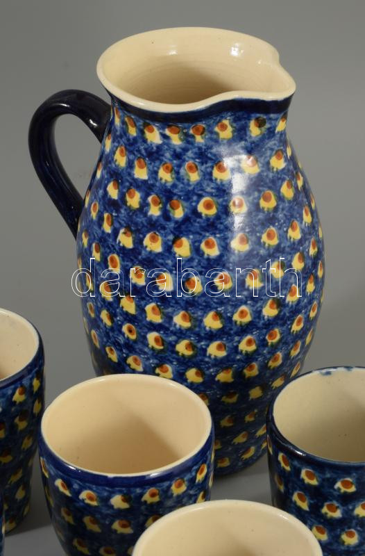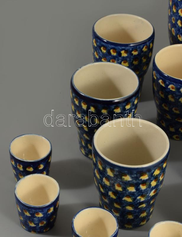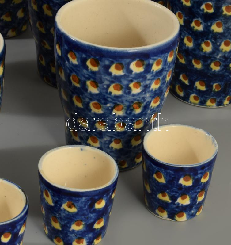 Antik pávaszemes mintás kerámia borozó-pálinkázó készlet, 6-6 pohárral, m: 21 cm