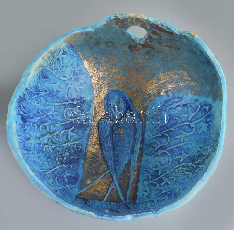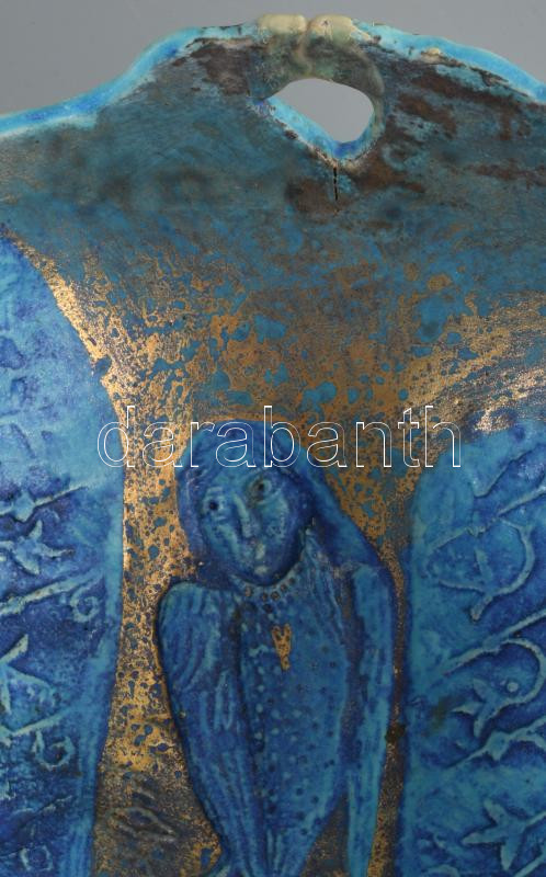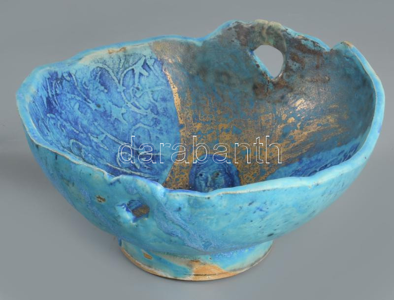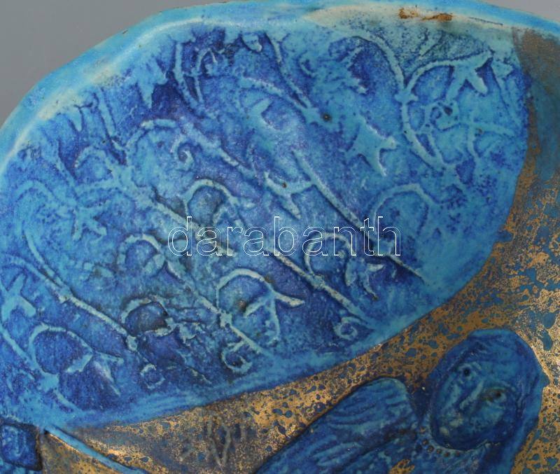 Kun Éva (1948-): Emberalakos kínáló. Türkizmázas, aljánál pattogzással, fülénél restaurált?, d: 23 cm, m: 12 cm