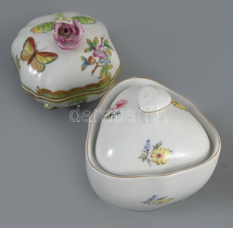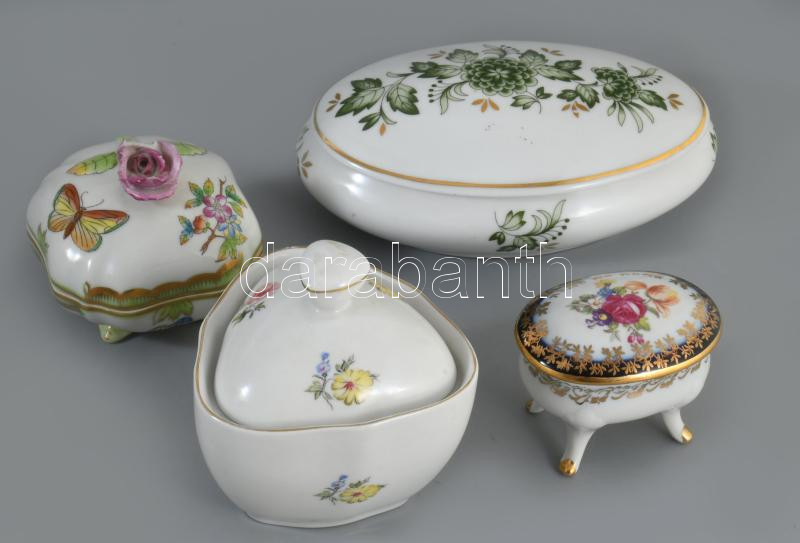 4 darab porcelán bonbonier, közte Herendi, sérült fogóval.