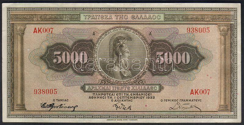 Görögország 1932. 5000Dr T:I- kis hajtás https://www.darabanth.com/de/52-Fernauktion/52.0/Numismatik/~247/Gorogorszag-1932-5000Dr-TI-kis-hajtas~II102669