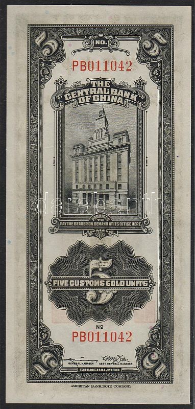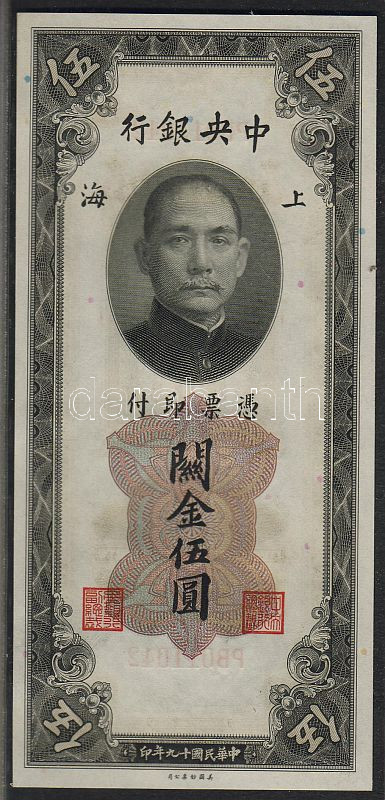 Kína/Central Bank 1930. 5CGU kék T:I https://www.darabanth.com/de/52-Fernauktion/52.0/Numismatik/~247/KinaCentral-Bank-1930-5CGU-kek-TI~II102643