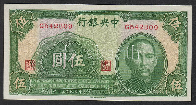 Kína/Central Bank 1941. 5Y zöld T:I https://www.darabanth.com/de/52-Fernauktion/52.0/Numismatik/~247/KinaCentral-Bank-1941-5Y-zold-TI~II102584