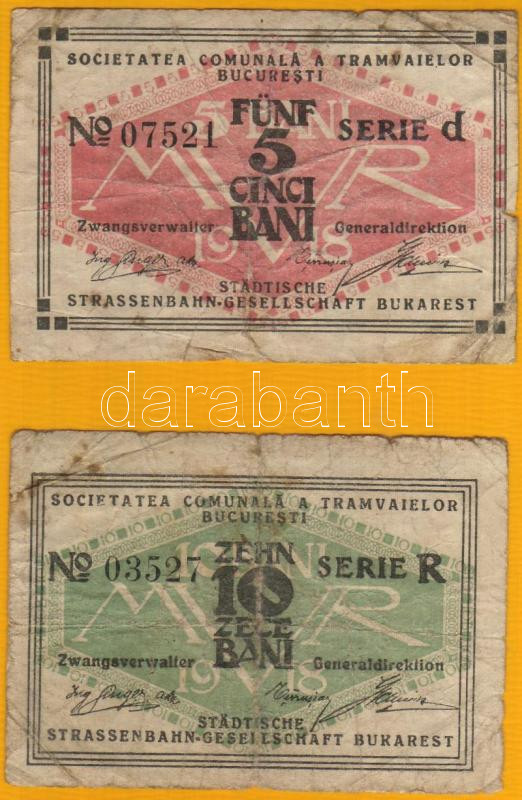 Beschreibung: Románia/Bukarest német megszállás I.V.H. 1918. villamos-szükségpénz 5B, 10B T:III/IV