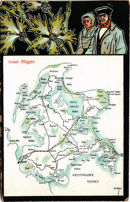 Insel Rügen, map of the island. Art Nouveau, floral, litho (glue marks)