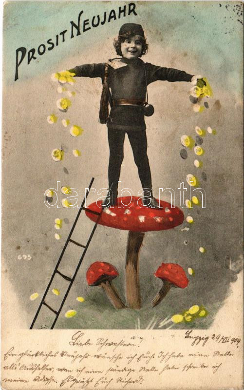 1904 Prosit Neujahr! / New Year greeting art postcard with chimney sweeper and mushroom (fl)
