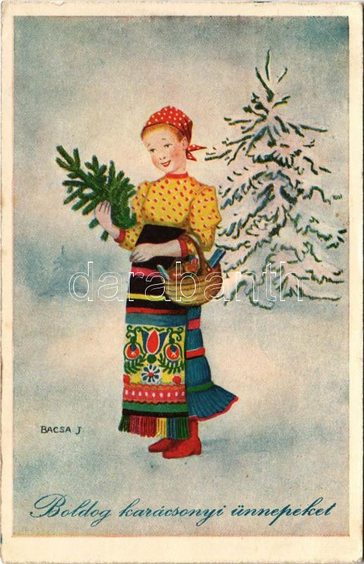 1938 Boldog karácsonyi ünnepeket / Christmas greeting art postcard, Hungarian folklore s: Bacsa J. (EB)