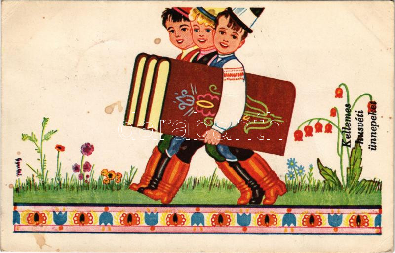Kellemes húsvéti ünnepeket / Easter greeting art postcard, Hungarian folklore s: Gyulai (fa)