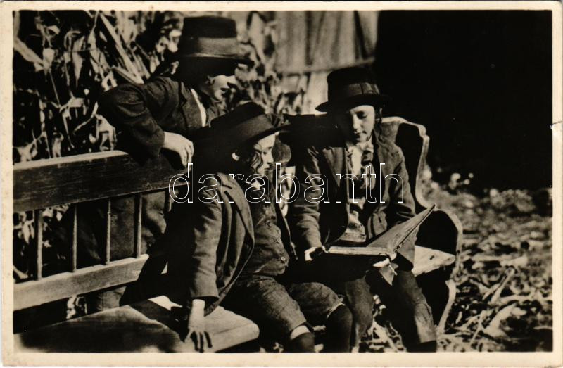 Kárpátaljai zsidó gyerekek tanulás közben, jövőbeli rabbik / Podkarpatská Rus. Budoucí rabini / Transcarpathian Jewish children studying, future rabbis. Judaica (kis szakadás / small tear)