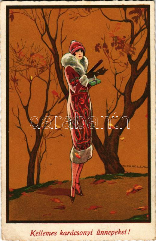 Kellemes karácsonyi ünnepeket! Olasz hölgy művészlap / Italian lady art postcard with Christmas greetings. Degami 874. s: T. Corbella