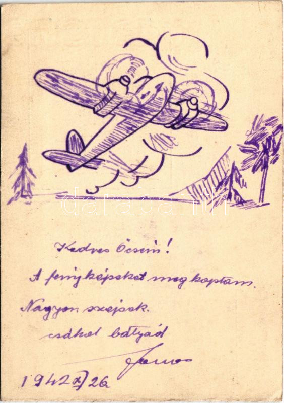 1942 Második világháborús tábori postai levelezőlap, a feladó saját kezű grafikájával / WWII Hungarian military field postcard, hand-drawn graphic art + "Tábori postahivatal 29" (EK)