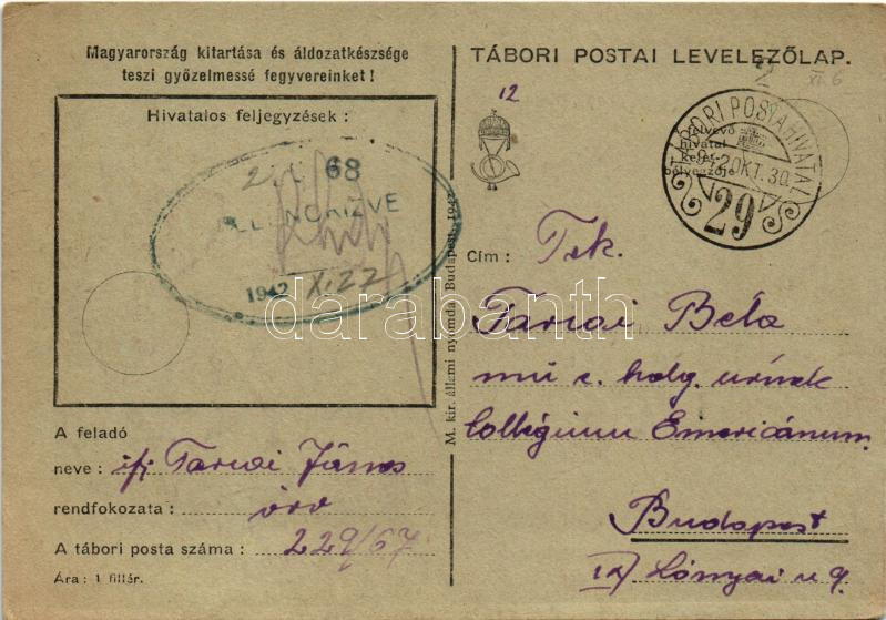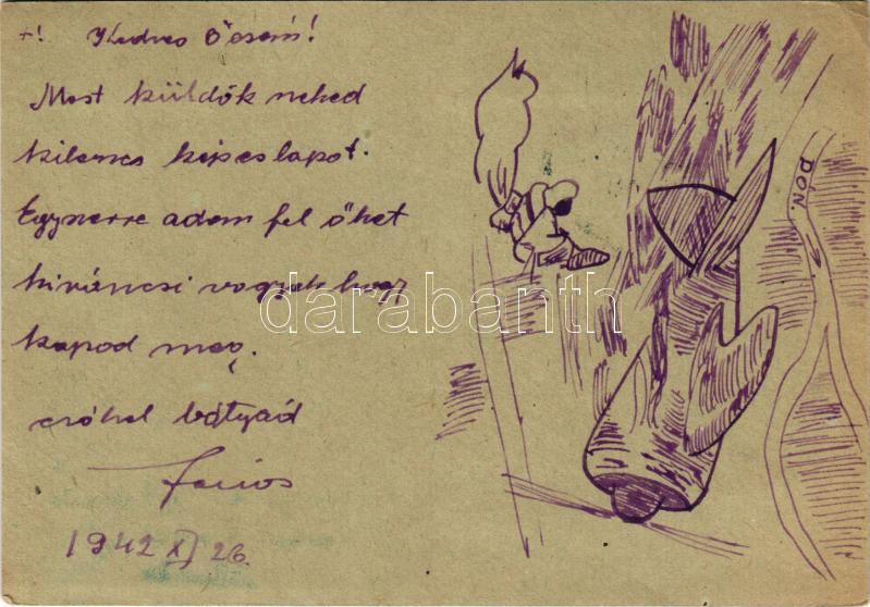 1942 Második világháborús tábori postai levelezőlap, a feladó saját kezű grafikájával / WWII Hungarian military field postcard, hand-drawn graphic art + "Tábori postahivatal 29" (EK)