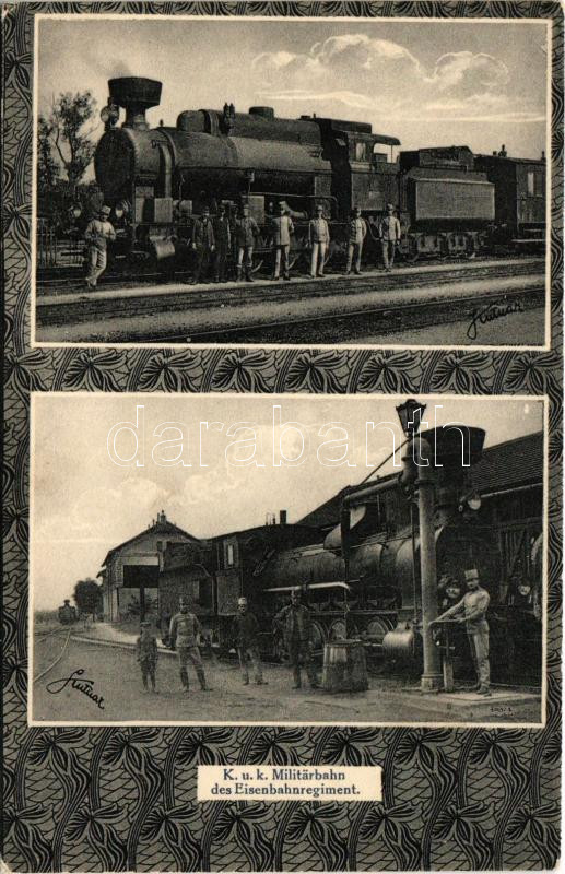 K.u.K. Militärbahn des Eisenbahnregiment / Cs. és kir. vasúti ezred, hadivonat / Austro-Hungarian Railway Regiment, military train, locomotive, railway station. Verlag J.L.K. 1914. Floral frame (EK)