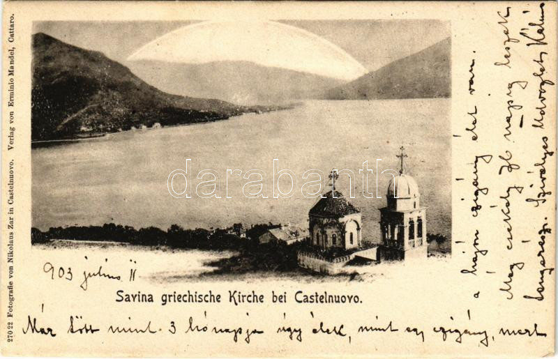 1903 Herceg Novi, Castelnuovo; Savina griechische Kirchei. Fotografie von Nikolaus Zar. Verlag von Erminio Mandel / monastery, church