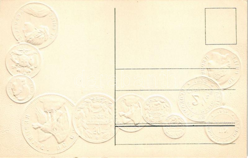 Chile. Münzenkarte und Nationalflagge / Chilean set of coins, currency exchange chart and flag. Emb. litho (lyuk / pinhole)