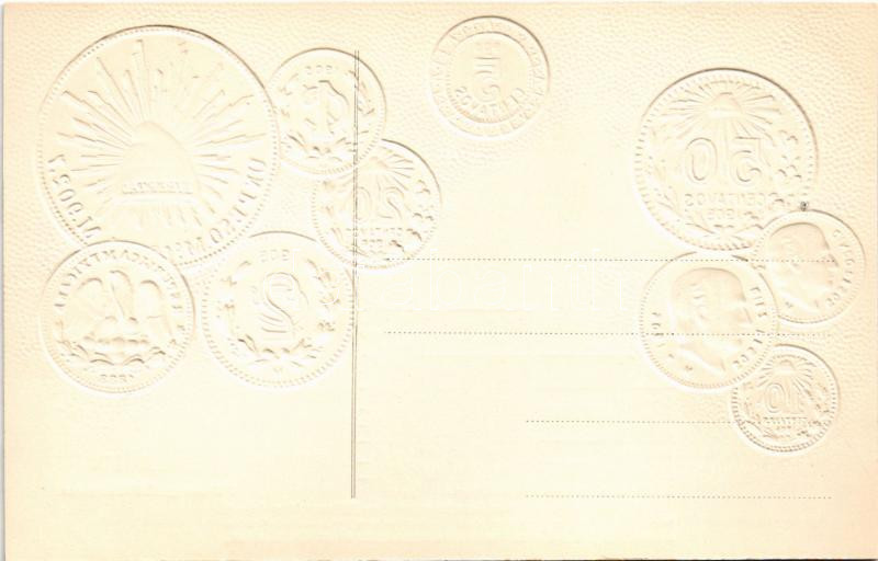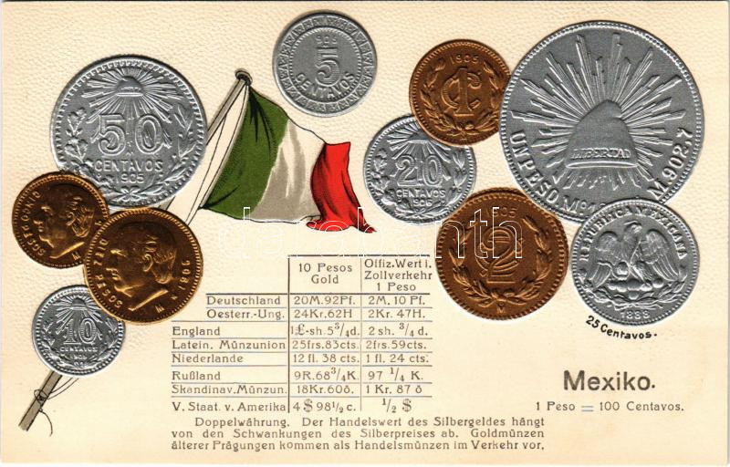 Mexiko / Mexico - set of coins, currency exchange chart and flag. Emb. litho (lyuk / pinhole)