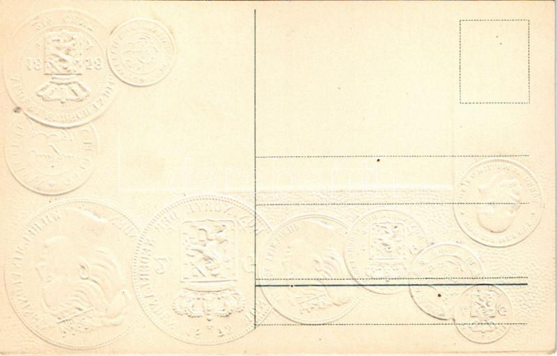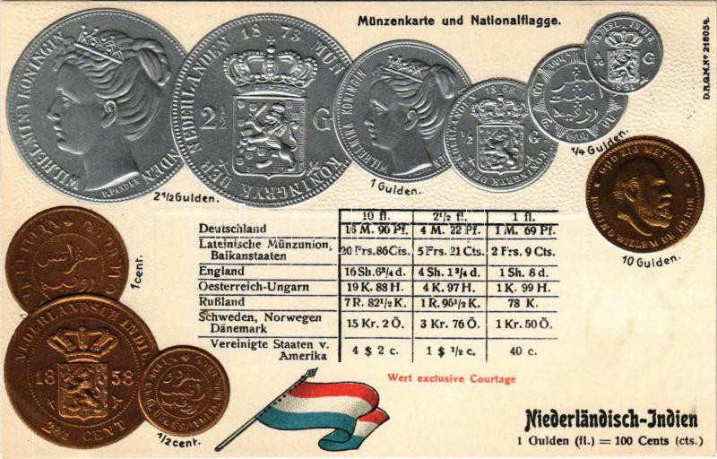 Niederländisch-Indien. Münzenkarte und Nationalflagge / Dutch East Indies - set of coins, currency exchange chart and flag. Emb. litho (lyuk / pinhole)