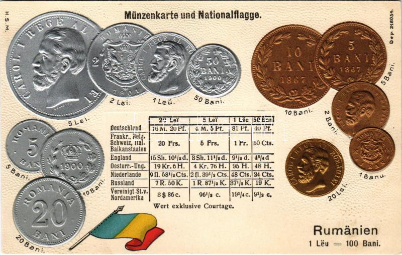 Rumänien. Münzenkarte und Nationalflagge / Romanian set of coins, currency exchange chart and flag. H.S.M. Emb. litho (lyukak / pinholes)