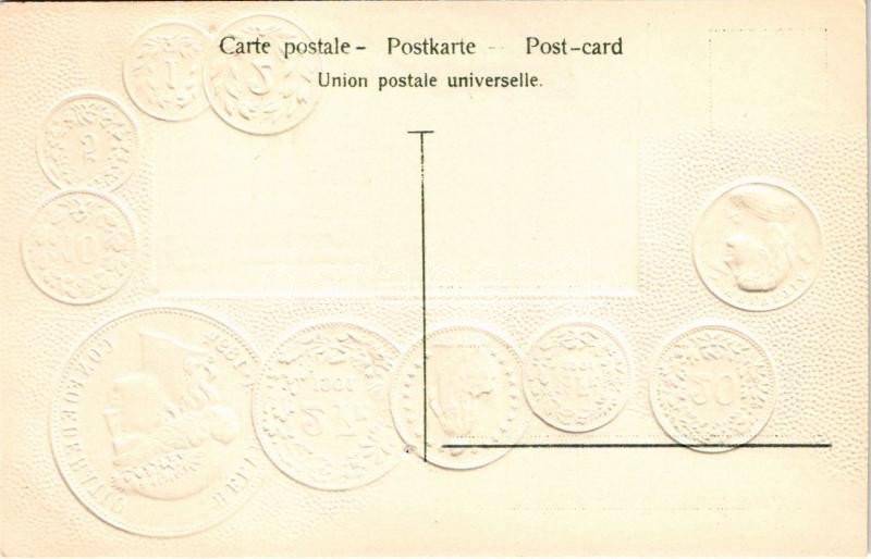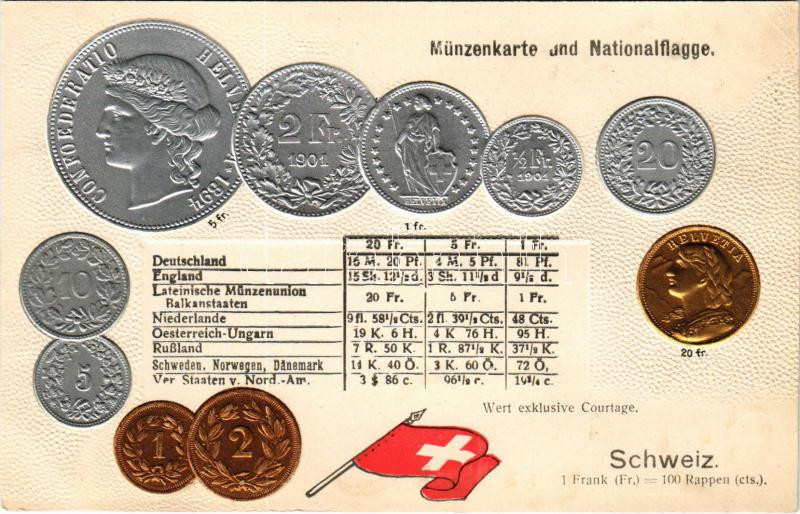 Schweiz. Münzenkarte und Nationalflagge / Swiss set of coins, currency exchange chart and flag. Emb. litho (lyukak / pinholes)