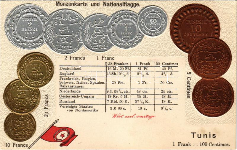 Tunis. Münzenkarte und Nationalflagge / Tunisian set of coins, currency exchange chart and flag. Emb. litho (lyuk / pinhole)