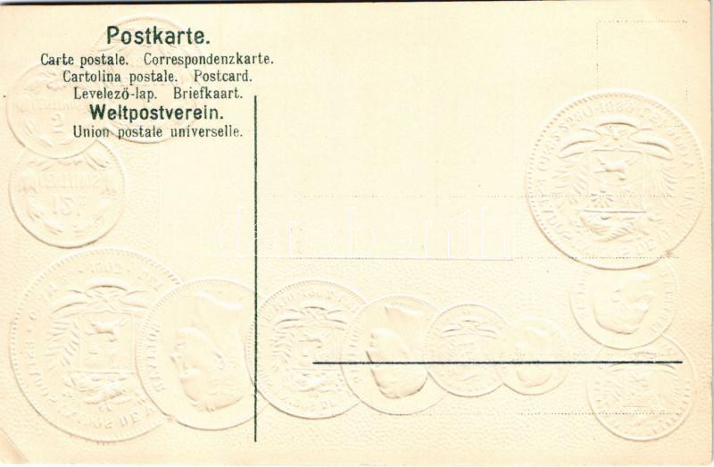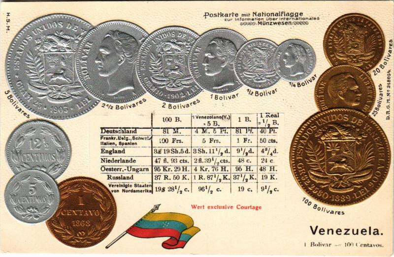 Venezuela / Set of coins, currency exchange chart and flag of Venezulea. H.S.M. Emb. litho (lyuk / pinhole)
