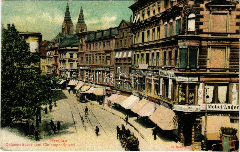 Wroclaw, Breslau; Ohlauerstrasse / street view, tram, café, shops (r)
