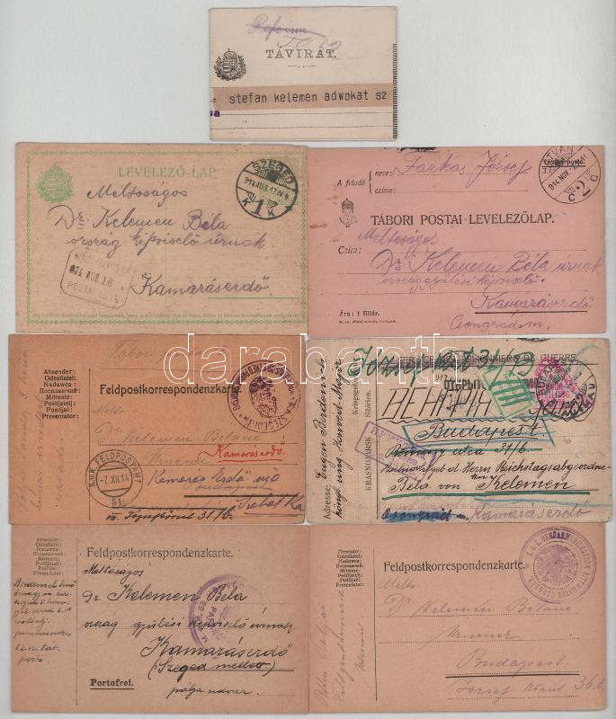 6 db RÉGI első világháborús osztrák-magyar tábori postai levelezőlap, közte 1 orosz hadifogságból küldött lap (Krasznojarszk, Szibéria) + 1 db távirat / 6 pre-1945 WWI K.u.K. military field postcards (Feldpostkarte), including 1 POW (prisoner of war) letter sent from Krasnoyarsk (Siberia, Russia) + 1 telegram