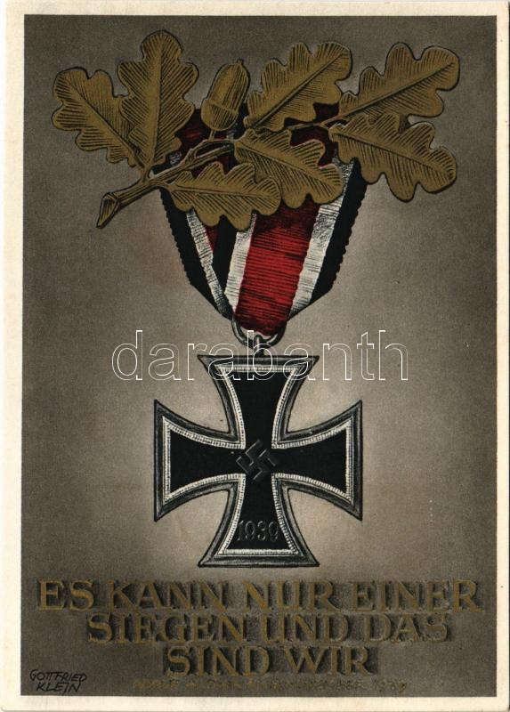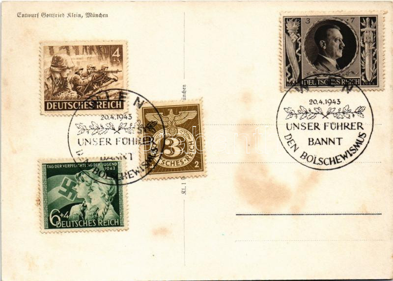 1943 "Es kann nur einer siegen und das sind wir" Adolf Hitler am 8. November 1939 / WWII NSDAP German Nazi Party propaganda postcard, Iron Cross, swastika s: Gottfried Klein + "Wien unser Führer bannt den Bolschewismus" So. Stpl. (ázott / wet damage)