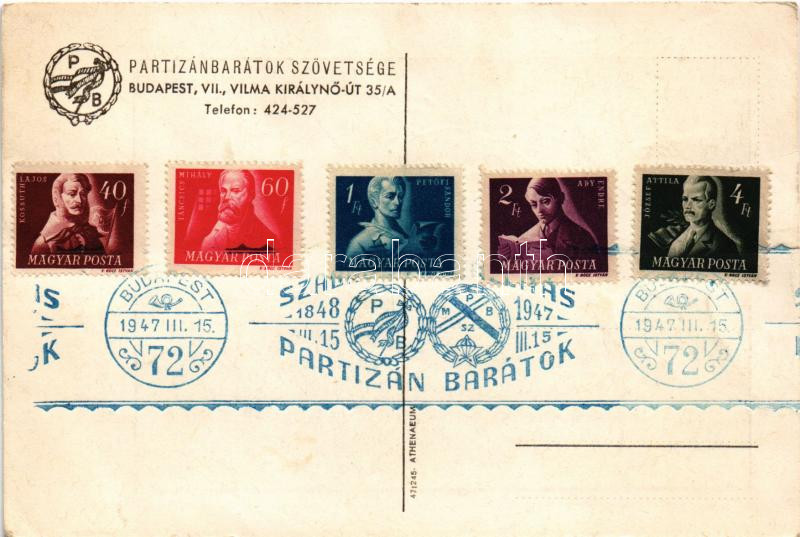 1947 Szabadságért, demokráciáért tarts velünk! Partizánbarátok Szövetsége kiadása / Hungarian partisan propaganda postcard + "1848-1947 III. 15. Szabadság Kiállítás Partizán Barátok" So. Stpl.