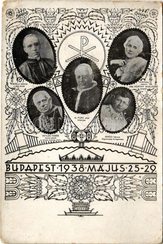 Budapest XXXIV. Nemzetközi Eucharisztikus Kongresszus. Pacelli bíboros a pápa követe, Horthy Miklósné Purgly Magdolna fővédnök, Heylen Tamás namuri püspök az állandó bizottság elnöke, XI. Piusz pápa őszentsége, Serédi bíboros Magyarország hercegprímása / 34th International Eucharistic Congress (EK)