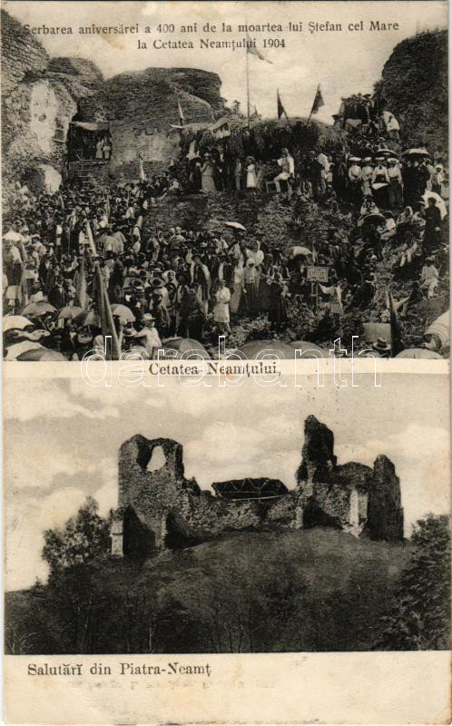 1908 Piatra Neamt, Karácsonkő; Cetatea Neamtului, Serbarea aniversarei a 400 ani de la moartea lui Stefan cel Mare la Cetatea Neamtului 1904 / castle ruins, 400th anniversary of the death of Stephen the Great at Neamt Fortress 1904. Editura Fotogr. L. Steinberg (EK)