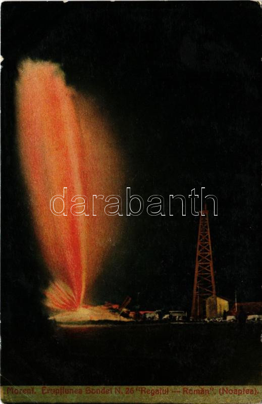 Moreni, Eruptiunea Sondei N. 26. Regalul-Roman. / oil plant, explosion, drilling tower (EB)