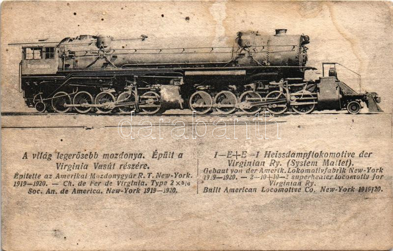 A világ legerősebb mozdonya. épült a Virginia Vasút részére / 1-E+E-1 Heissdampflokomotive der Virginian Ry. (System Mallet) / American locomotive (ázott / wet damege)