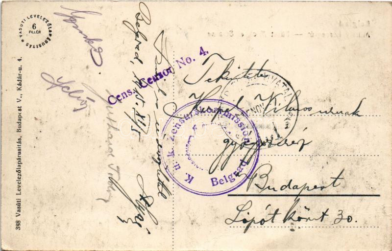1915 Beograd, Belgrade, Belgrád; Mihály herceg út, üzletek. Vasúti levelezőlapárusítás 388. / Fürst Michael Strasse / street view, shops + "K.u.K. Zensurskommission Belgrad" "Cens. Censor No. 4." (fa)